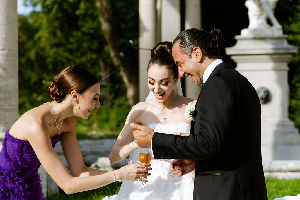 One of the most beloved Persian wedding traditions is the consent ritual. The officiant first asks the groom for his agreement, which he gives immediately. When the bride is asked, she traditionally stays silent until the third request. Guests join in with playful interruptions, creating excitement until the bride finally answers “Baleh” (yes). This cherished moment marks the beginning of their life together.